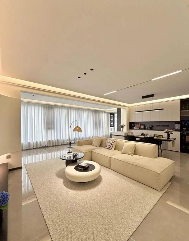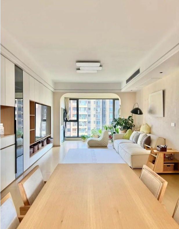 它能满足家庭生活的各种需求:可以摆下一张大餐桌,兼当餐厅用;可以空出一块地方,铺上垫子给孩子当玩耍区;甚至还能在角落塞一个书架和单人沙发,当成小小的阅读角。